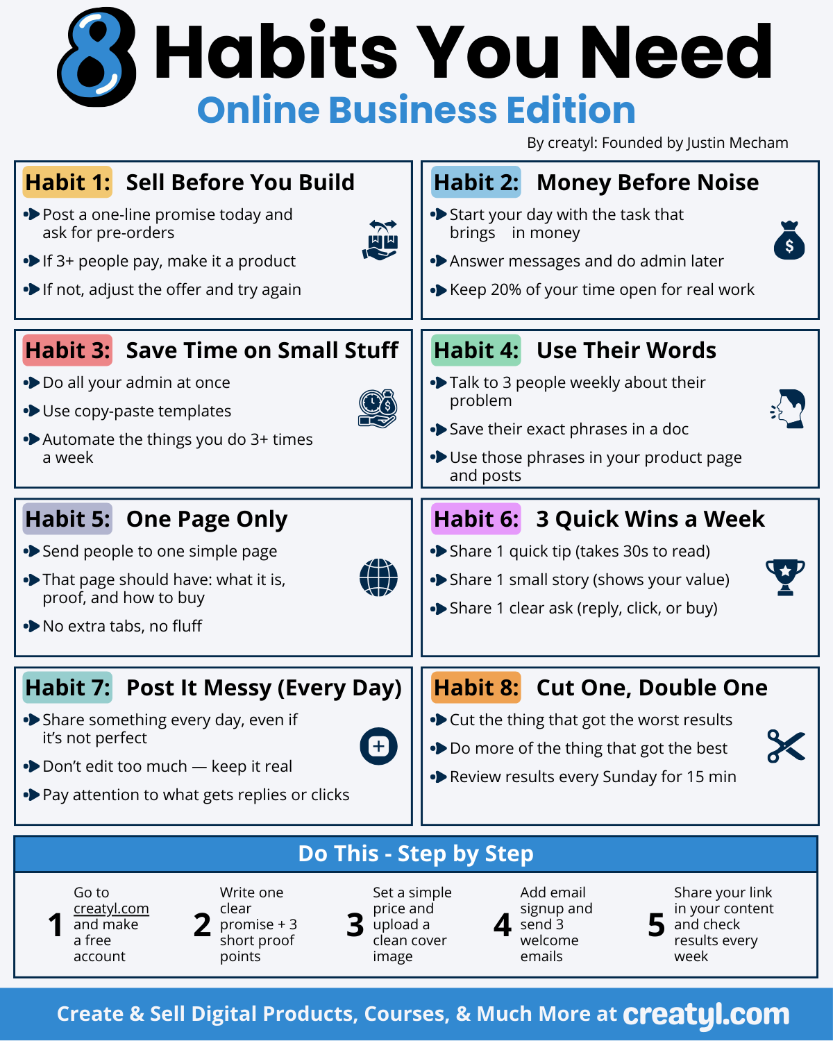 The infographic you saw earlier outlines eight habits that make digital business dramatically easier—habits that shrink overwhelm, increase clarity, and create results without burnout.