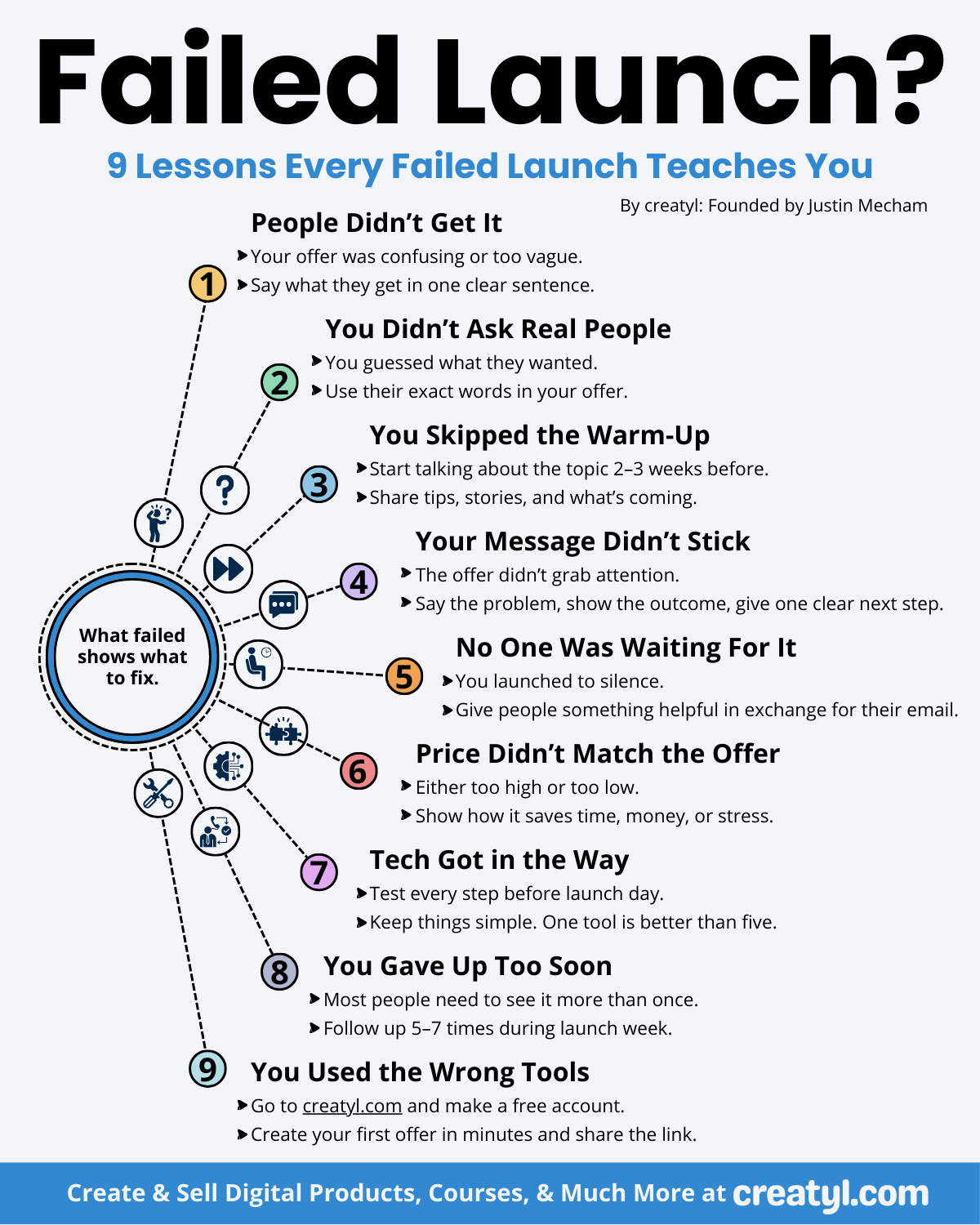 This infographic lays out the nine signals every failed launch gives you, so you can quickly spot what went wrong and what to adjust next—without overthinking or starting from scratch.