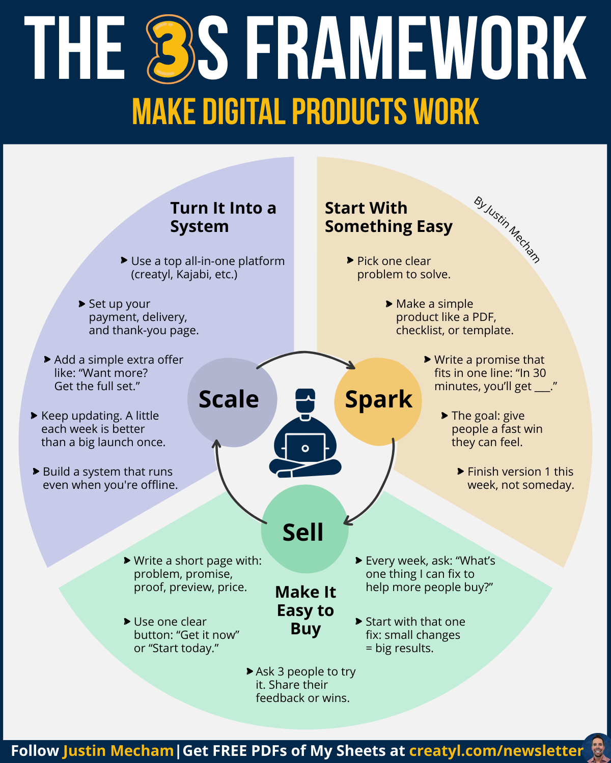 It breaks down Spark, Sell, and Scale into a simple loop you can follow step by step while building your own digital product.