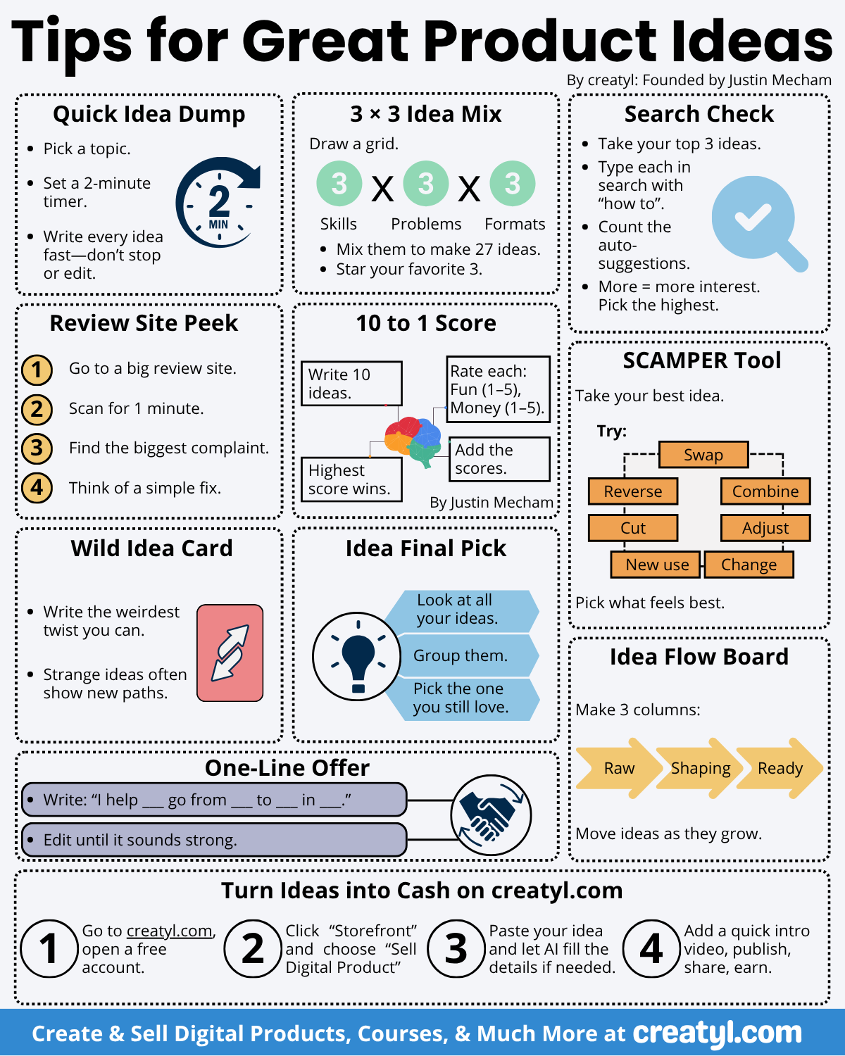 A freelancer had ideas for an ebook, a coaching workshop, a Notion template, and a few digital kits.